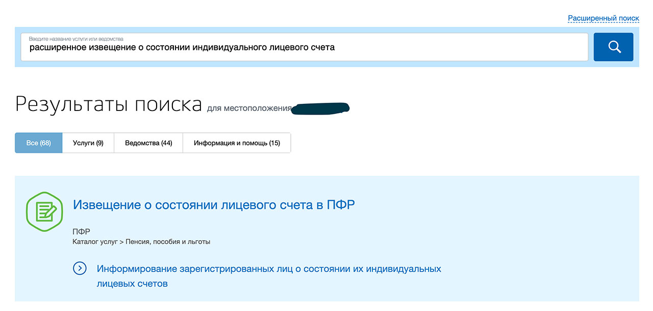 - Вводите в поисковой строке “Расширенное извещение о состоянии индивидуального лицевого счета”;